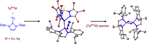 Phosphinoazide complexes of the composition TpBr3M-L (M = Cu, Ag, and L = 2-azido-1,3-bis(2,6-diisopropylphenyl)-2,3-dihydro-1H-1,3,2-diazaphosphole) have been synthesized and structurally characterized. Their thermal decomposition led to cyclodiphosphazenes as a result of the metal-mediated coupling of two nitrene units in a process that takes place in both a stoichiometric and catalytic manner. Experimental data have allowed proposing a mechanistic pathway for this new transformation.