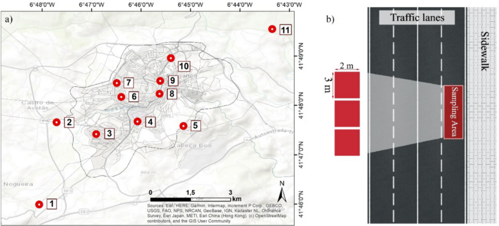 a Location of monitored streets in the municipality of Bragança, and b) road sampling configuration