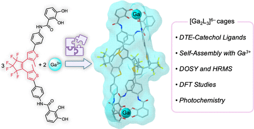 Two new photoswitchable dithienylethene (DTE)-catechol ligands, specifically designed for group 13 metal coordination, were synthesized via Suzuki coupling reactions from a dichloro-DTE building block, each with varying longitudinal extensions. The shorter DTE-catechol ligand did not efficiently assemble with Ga3+ metal ions; however, elongation with a phenylene-amide spacer group enabled the successful formation of a novel triply DTE-functionalized coordination [Ga2L3]6– cage. This cage represents a unique example of integrating DTE photoswitches with main group metals in a supramolecular coordination framework. The [Ga2L3]6– cage was thoroughly characterized by NMR spectroscopy, including DOSY hydrodynamic volumetric analyses, high-resolution mass spectrometry, computational DFT, and photochemical analyses. The DFT studies highlighted the structural integrity and dynamic interplay within the helicate and mesocate isomeric forms of the [Ga2L3]6– cage upon photoswitching. While the free ligands exhibited all-photonic reversible switching at up to mM concentrations upon alternating irradiation at 365 and >495 nm, the [Ga2L3]6– cage demonstrated these capabilities under dilute μM conditions, albeit with lower efficiency and fatigue resistance. This behavior highlights the intricate relationship between rigid coordination with main group metals and the flexibility of the photoswitchable DTE ligands within the [Ga2L3]6– cage.